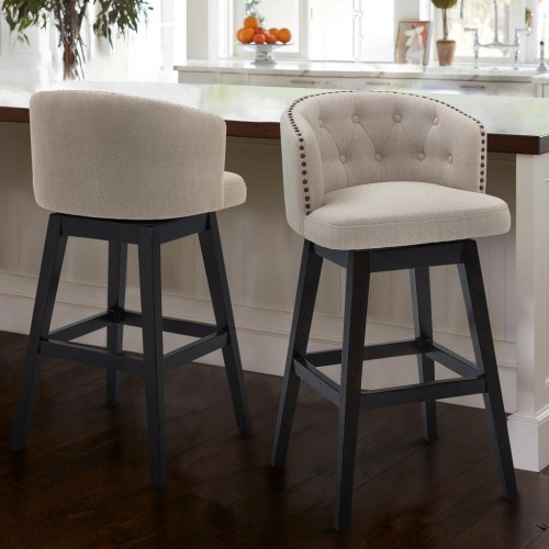 30″ Tan Tufted Fabric and Dark Espresso Wood Swivel Bar Stool