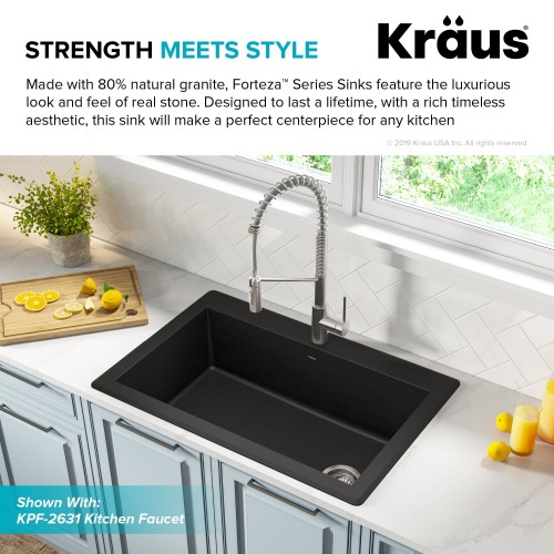 KRAUS Forteza 33″ Dual Mount Single Bowl Black Granite Kitchen Sink in Black