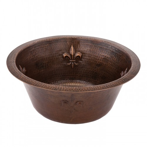 Premier Copper Products 16″ Round Copper Bar Sink with Fleur De Lis and 2″ Drain Size