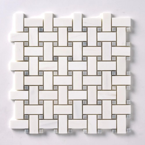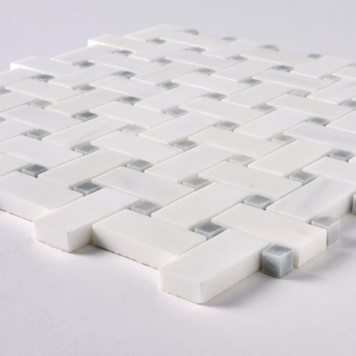 Bianco Dolomite Polished Basketweave w/ Blue – Gray Dots Mosaic Tile