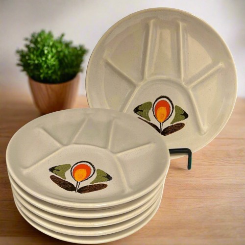 6 Fondue Plates, Retro Mid Century Divided Plate Set, BBQ, Faience Pottery