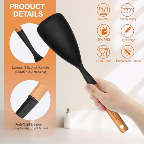 Silicone Cooking Spoon and Pasta Fork Set, 2 Pack Large Spatula Spoons Set with Wooden Handle, Nonstick Multifunction Spoon for Cooking, Serving, Mixing and Spaghetti (Black)