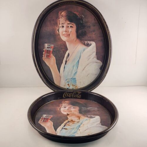 2 Coca Cola Oval Tin Trays 1973 Reproduction of 1923 Flapper Girl Ad Vintage