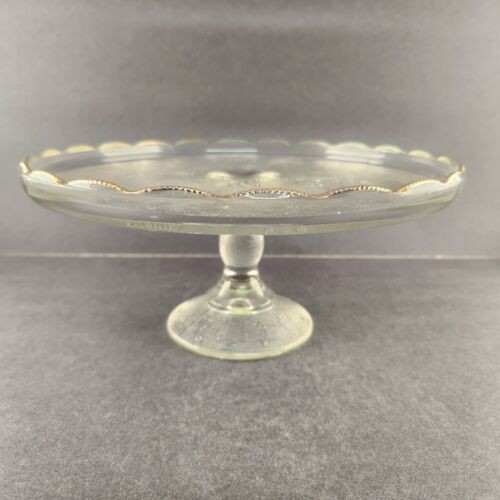 Pedestal Cake Plate Stand Harp Pattern Jeanette Glass Gold Trim 1950’s Vintage
