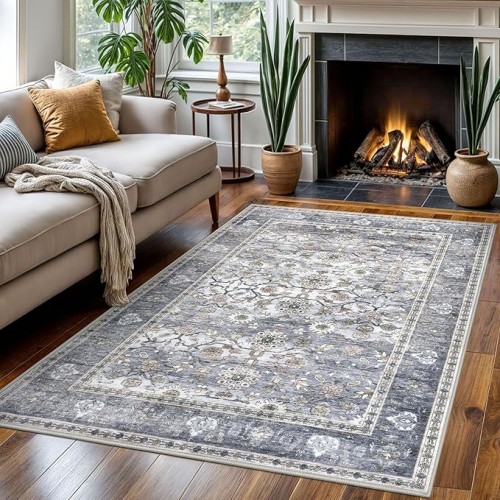 KUTA Washable Rug 4×6 Area Rug, Vintage Rug Indoor for Living Room, Non Slip Machine Washable Large Rugs, Soft Print Distressed Grey Blue Farmhouse Carpet for Bedroom Dining Room Dorm Office