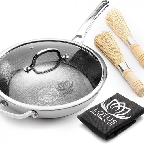 Hybrid Wok Pan, Nonstick, PFOA Free 12 Inch Induction Wok With Lid, Dishwasher Safe Cooking Pan For All Cooktops, Stainless Steel Cookware, Woks & Stir-Fry Pans, Bonus Bamboo Dish Brush
