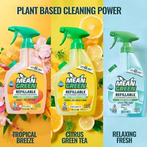 Mean Green Ultra Powered Refillable Cleaner Concentrate Variety 3 Pack – Multi-Purpose Citrus & Green Tea, Bathroom Tropical Breeze, Glass Fresh – 14.3 fl oz Each