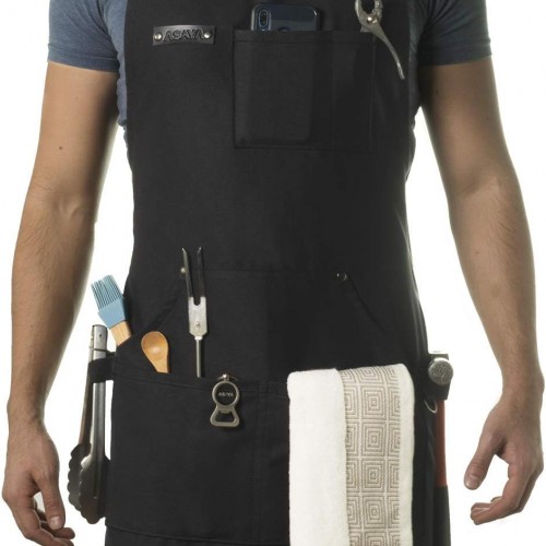 Asaya Chef and BBQ Apron with Bottle Opener and Hand Towel – 10oz Cotton Canvas, Stainless Steel Hardware – Cross Back Straps