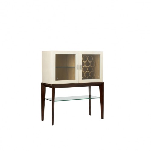 Beauty and function combine to create barcley bar cabinet. Covered in natural raffia, this two door cabinet is the ideal place to conceal all of your cocktail needs. Inside features include a rack for up to twelve wine glasses, a shelf for mixing cocktails, two drawers to hold napkins and accessories, and seven slots for your bottle of choice. Not intended for clothes storage.