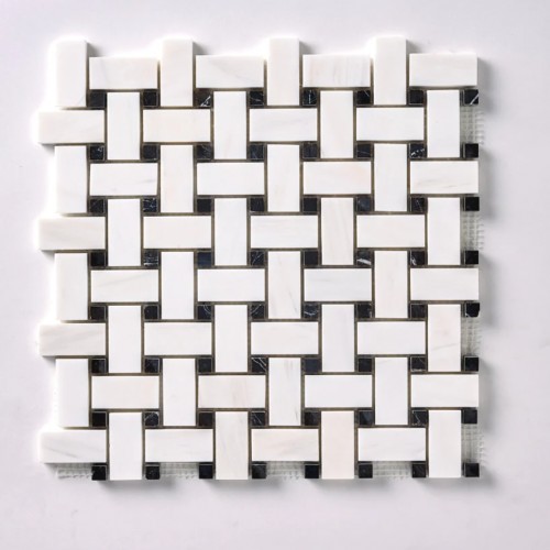 Bianco Dolomite Premium White Polished Mosaic Basketweave with Black Dots