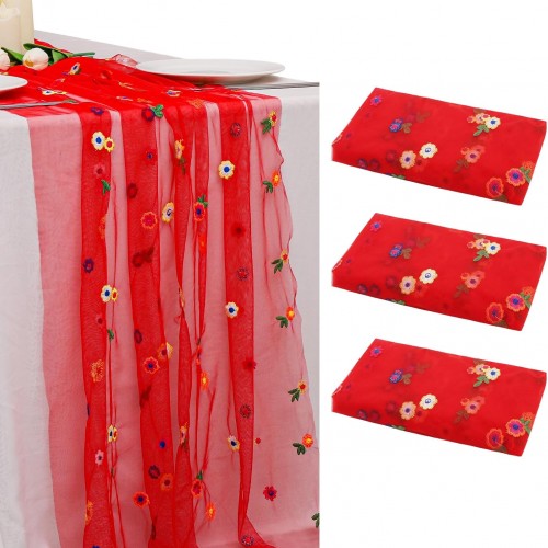 BINBE 12pcs Daisy Fall Table Runner Embroidery Gauze 10FT Florals Seasonal Tulle Holiday Birthday Kitchen Dining Table Decor for Home Party Pink