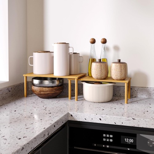 - 【Flexible Combination, Space Optimization】With their unique design, with one slightly smaller than the other, these shelf organizers can be stacked on top of one another, nested, used separately, or even in an L-shape.It is a flexible storage solution that transforms your kitchen into a more organised and tidy space.
