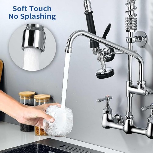 - The pre-rinse sprayer’s hold-down ring design allows for continuous rinsing without squeezing the handle, even during peak hours. The industrial faucet sprayer comes with a 18-inch hose that easily reaches any corner. It effectively cleans sauces and food residue from dishes at a high pressure of 1.42 GPM before they are loaded into the dishwasher.