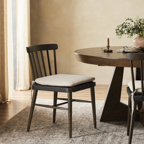 A new take on the Windsor dining chair silhouette. Spindle back meets a grid-woven seat for a monochromatic look broken up by a detachable seat cushion.