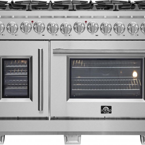 The 48” Forno Capriasca French Door Dual Duel Range brings professional styling and quality into your home kitchen with its durable stainless-steel design. The gas rangetop has 8 sealed dual-ring brass burners with a total stove top output of 160,000 BTU for simmering delicate tasks like melting chocolate or cooking sauces, giving you the ability to cook up whatever delicious meals you desire. The heavy-duty continuous cast iron grates allow for even heat distribution and maximum stability of cookware mobility over a recessed enamel cooktop cavity which keeps spills and splashes contained and easy to clean. Double electric ovens have a combined 6.58 cu.ft. capacity with a total output of 9,700 Watts encased in a speckled blue enamel interiors and tempered 3-layer glass oven door windows. Right-side oven consists of a true convection fan function. Included is an LP conversion kit, 6 stainless steel telescopic oven racks, wok-ring, reversible grill/griddle, rotisserie kit and skewers forks, air fry basket with rack and drip pan. Housed in a high-grade 304 and stainless steel body and zinc coated metal knobs and bezel, this unit sports a stylish look that is built to last.