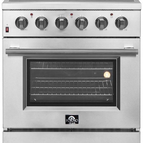 Galiano 30″ Freestanding Electric Range The Forno Galiano 30″ Alta Qualita Pro-Style Freestanding Electric Range brings professional styling and quality into your home kitchen with its durable stainless-steel design. Stovetop has 4 radiant elements with a total output of 6,500 watts and features a cavity top plate. The 4.32 cu. ft. capacity oven has a combined broil and bake output of 4800 watts and 1500 watt true convection fan. Included are 2 electroplated oven racks and power cord. Ensure precision with your cooking using the unit’s thermostat and regulator. Housed in a high-grade stainless steel body with a tempered 3-layer glass oven door windows and control knobs, this unit sports a stylish look that is built to last