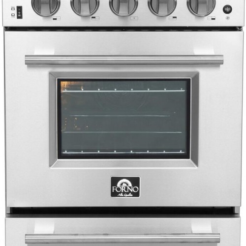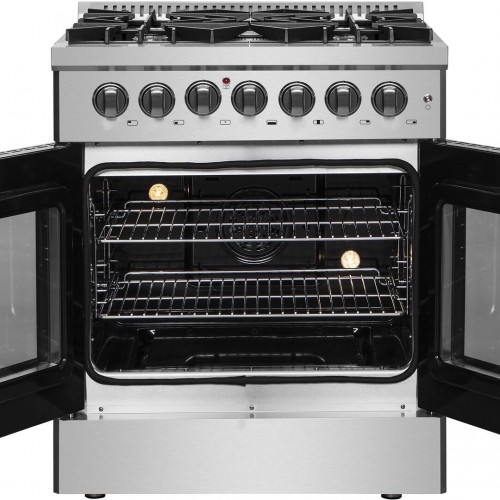 The 30″ Galiano Dual Fuel French Door Range brings professional styling and quality into your home kitchen with its durable stainless-steel design. Unique French doors take up to 12″ of less open door space and easily open simultaneously with one hand. Cooktop has 5 sealed burners with a total stove top output of 68,000 BTU including 1 sealed dual-ring burner for simmering delicate tasks like melting chocolate or cooking sauces, giving you the ability to cook up whatever delicious meals you desire. The continuous cast iron grates allow for even heat distribution and maximum stability of cookware mobility over a recessed enamel cooktop cavity which keeps spills and splashes contained and easy to clean. The 4.32 cu. ft. gas oven with a total output of 4,800 Watts is encased in a black enamel interior fitted with a true convection fan ensuring to achieve fast, precision, and consistent oven cooking along with easy viewing is a 3-layer glass oven door window. Included are 2 chrome plated oven racks and LP conversion kit. Housed in a high-grade stainless steel body and zinc knobs, this unit sports a stylish look that is built to last. All Forno products are backed by an iron clad 2-year warranty for your satisfaction.