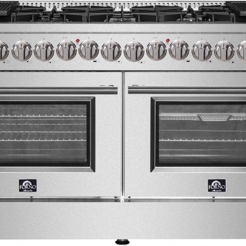The Forno 60″ Galiano 8.64 cu. ft Gold Professional Freestanding Range with Gas Stove and Gas Oven brings professional styling and quality into your home kitchen with its durable stainless-steel design. The cooktop has 10 sealed burners with a total stove top output of 49,000 BTU and features continuous cast iron grates. The 60” oven has a capacity of 8.64 cu. ft. with a combined broil and oven output of 142,000 BTUs. An internal convection fan achieves fast and consistent oven cooking. Included are 4 electroplated oven racks, 2 cast iron griddles, an LP conversion kit, and a power cord. Ensure precision with your cooking using the unit’s thermostat and regulator. Housed in a high-grade #430 stainless steel body with a tempered 3-layer glass oven door and zinc knobs, this unit sports a stylish look that is built to last.