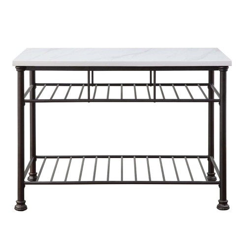 Minimalistic design paired with clean, simple color. The Freyja Kitchen Island gives off a light and airy feel to a compact cooking space. Clean-lined metal frame is topped with a artificial stone top, creating a sleek, modern silhouette that gives your kitchen an open feel. Spacious rectangular table top with two tier shelf provides more countertop space and storage. Use this stylish yet functional addition to complete your kitchen decor.