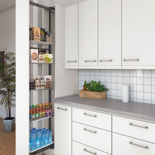 Make the most of a narrow space in your kitchen with Hafele’s Pull-Out Base Towel Rail 90° and organize your baking trays, serving trays or cutting boards. With 26.4 lbs load bearing capacity, very durable made of steel with a chrome plated finish. With Soft & Silent closing and full extension type of pull-out mounted right-hand side. For internal cabinet width 4 1/2″ (112 mm), Internal cabinet depth 19″ (481 mm) and Inside cabinet height 23 1/4″ (590 mm). The Pull-Out Base is supplied with full extension slides.