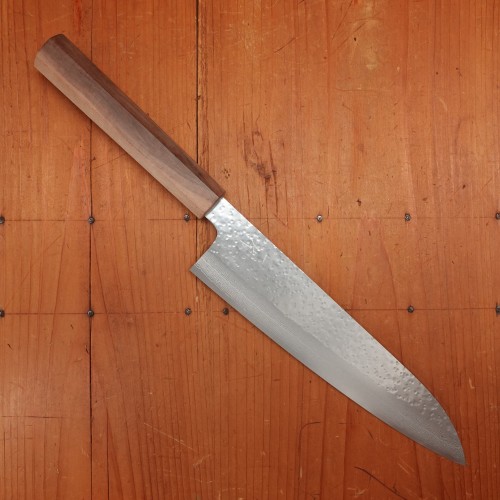 These knives have a stainless suminagashi or damascus cladding over a high alloy HAP 40 core with a walnut wa-style handle.