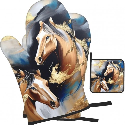 Horse Oven Mitts and Pot Holders Sets of 3 Modern Kitchen Decor Heat Resistant Hot Pads Funny Oven Gloves for Cooking Grilling Baking
