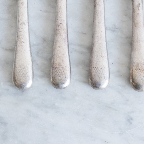 While domestic silver-plated flatware was typically intended for private homes and occasional use, hotel silver prioritized strength, balance, and longevity over decorative detail. Handles tend to be thicker, forms more restrained, and finishes more utilitarian. Ownership monograms were commonly engraved to identify institutional sets and discourage loss.
