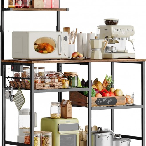 Huuger 39.4 Inch Bakers Rack with Power Outlets, Kitchen Microwave Stand with Storage, Coffee Bar with 4 Hooks, 3-Level Height Open Shelves, Rustic Brown