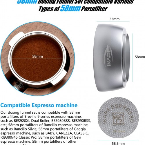 IKAPE Magnetic Dosing Funnel Set, 58MM Espresso Dosing Ring & Puck Screen Kit Compatible with 58MM Bottomless Portafilter – with 10 Small Magnet (Silver)