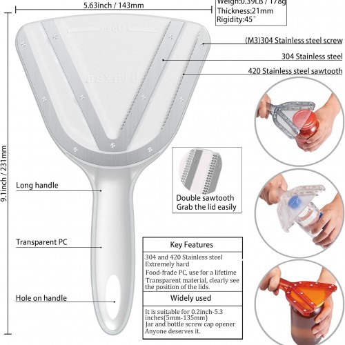 - Easy effective:Sharp dual stainless steel teeth grip lid firmly, reducing force required to open jar,contoured non-slip handle for better leverage,allowing the opener to do the work rather than your hands and wrists.