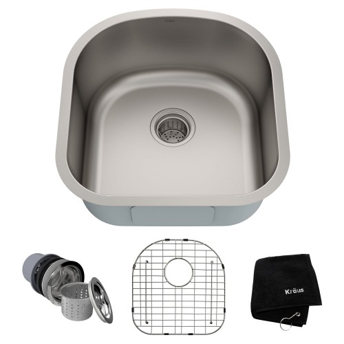 KRAUS kitchen sinks are known for excellent quality and sturdy construction. Made with durable T-304 stainless steel, this undermount sink will stand up to constant use, easily handling your toughest kitchen tasks. Commercial grade satin finish makes maintenance as easy as wiping the surface with a damp cloth. This model is made from sturdy dent-resistant 18-gauge steel that reduces vibration when the sink is in use, for a lower-toned basin that does not sound tinny. NoiseDefend soundproofing technology ensures a quiet kitchen experience by eliminating noise from dishes and waste disposal. All KRAUS stainless steel sinks come with free kitchen accessories, including a dish towel and strainer.