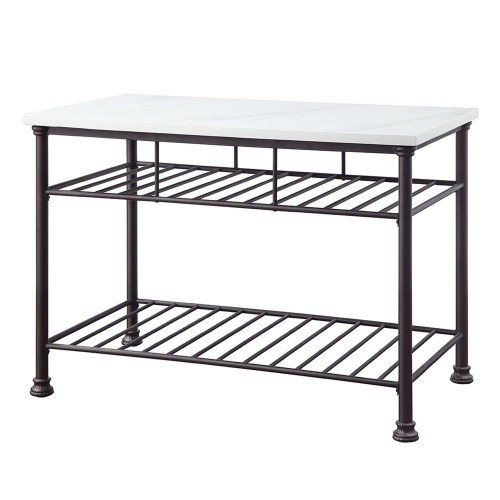 The Lanzo Kitchen Island is equally ideal for counter space or an excellent choice for display with extra storage. Blending contemporary style with industrial charm, the design is both stylish and functional. The metal frame adds a touch of industrial impression to the modern marble top style. Featuring four open shelves this is a must-have for every home.