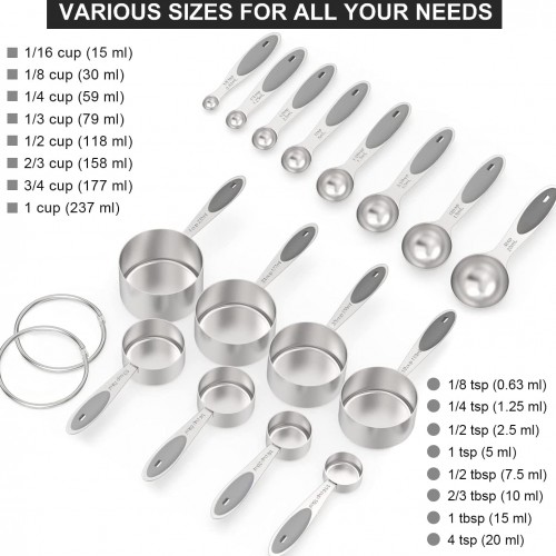 - SET OF 16: Including 8 Measuring cups (1/16 cup, 1/8 cup, 1/4 cup, 1/3 cup, 1/2 cup, 2/3 cup, 3/4 cup, 1 cup), 8 Measuring spoons (1/8 tsp, 1/4 tsp, 1/2 tsp, 1 tsp, 1/2 tsp, 2/3 tbsp, 1 tbsp, 4 tbsp). Meet all your needs on cooking and baking