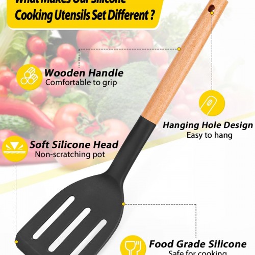 Pack of 4 Silicone Cooking Utensils Set, Non Stick Solid Spatulas and Heat Resistant Slotted Spoons with Wooden Handle, Ideal Wood Kitchen Utensils Set for Frying,Serving,Turning,Stirring (BLACK)