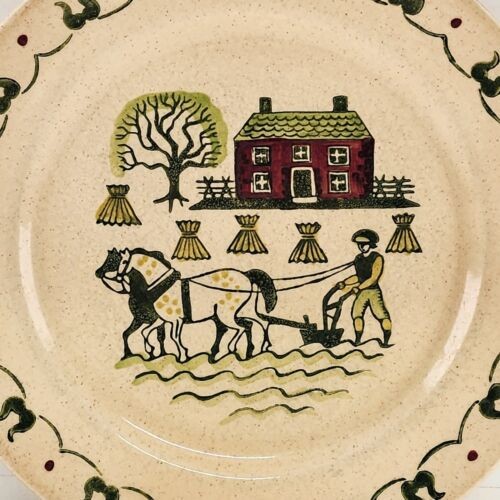 This vintage one-piece salad plate by Metlox is a beautiful addition to any collection. The round plate has a beige color with a glossy finish and features a decorative Poppytrail pattern. Its colonial style and handmade stoneware material make it perfect for all occasions. The plate has a diameter of 7.5 inches and a height of 0.25 inches. It is recommended to hand wash only and has no manufacturer warranty. The backstamp is printed and it weighs 11 oz. This original piece was manufactured in the late 20th century (1970-1999) in the United States.