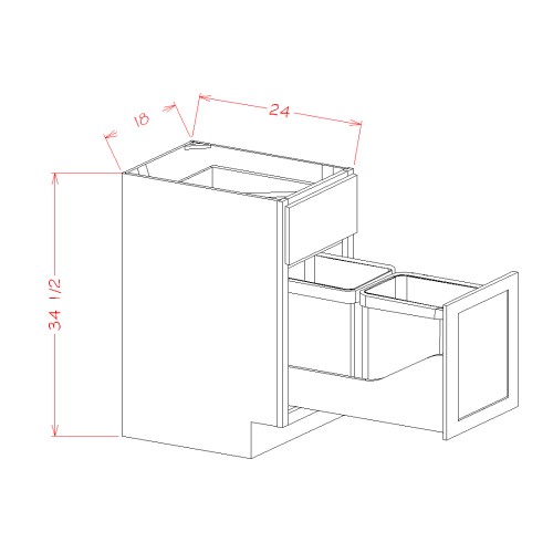 Pure White 18″ W x 34.5″ H x 24″ D single door base cabinet with with 1 drawer and double trash can insert. Trash cans are not included. Holds (2) 13 gallon trash cans.
