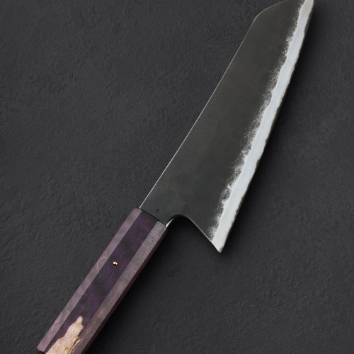 A beast of a gyuto by Australian bladesmith James Oatley, dressed in purple, ready to dominate the kitchen with power and grace. Tough, short, subtly convex bevels of stainless-clad san mai with a hard, thin, razor-sharp edge of V-Toku2 carbon steel provide the workhorse durability balanced with precise and refined geometry to tackle every cut, from the most demanding to the most detailed. A slim, near-zero edge and fine, pointed tip combined with the knife’s weight and forward-leaning balance will help this blade perform a bit like a double-bevel deba, with a tall heel and gyuto-leaning edge profile suited to chopping jobs at the same time. Dark, forged-finished flats show each purposefully placed hammer mark imprinted by James at his studio in Sydney, while the bevels receive a silky, hand-sanded, high-polished finish for cutting performance. Nicely rounded at the spine and choil, together with a robust, octagonal wa-style handle in purple-dyed and stabilized maple wood, offer comfort and control in any grip. Domed and hand-peened, a single bronze pin allows for handle removal in the case that maintenance is needed.