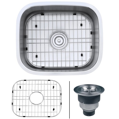 - Included in box: Sink, cut-out template, rinse grid, basket strainer, mounting brackets