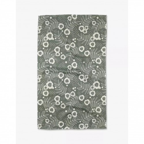 This tea towel is a beautiful sage green with a cream colored floral pattern printed on it.
