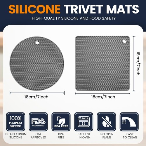 - 2、Non-slip and high heat resistant: These trivets for hot dishes are heat-resistant from -104℉ to 446℉, Protect your countertop or table from hot pots, hot pans coming out from the microwave or stove. Silicone trivet is non-slip to make nothing slide off.