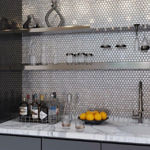 Add a layer of elegance to the vanity backsplash, shower wall, or tub surround with this gorgeous silver hexagon tile. It pairs beautifully with neutral furnishings and metallic accents for instant glam. Beyond beauty, glass mosaics deliver robust durability and resistance against water and stains. With proper care, these hexagon beauties will retain their splendor for years.