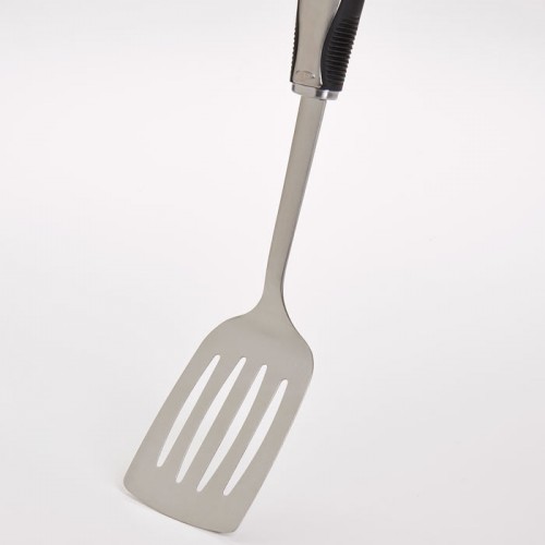This stainless steel spatula features brushed stainless steel handles for strength and durability, and our trademark flexible “fins” for ultimate comfort. Dishwasher safe.