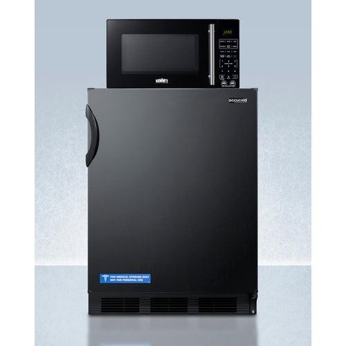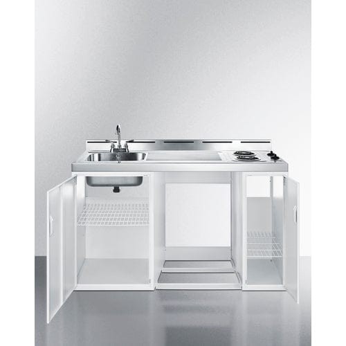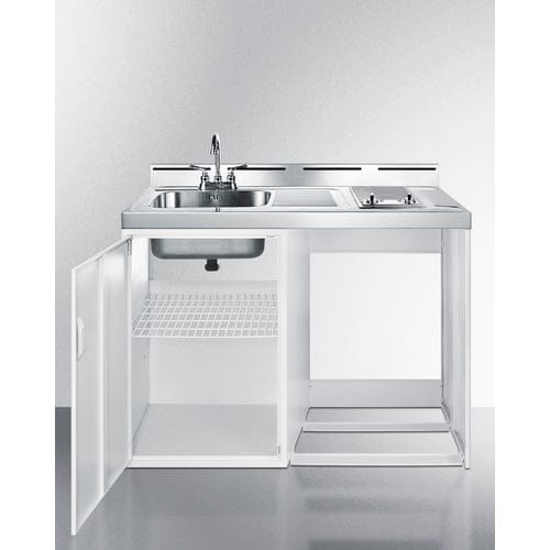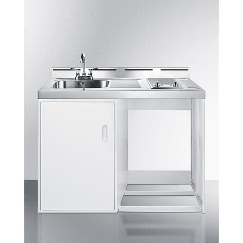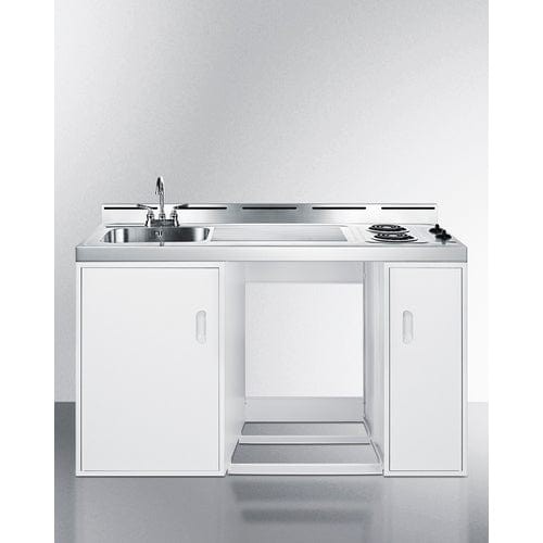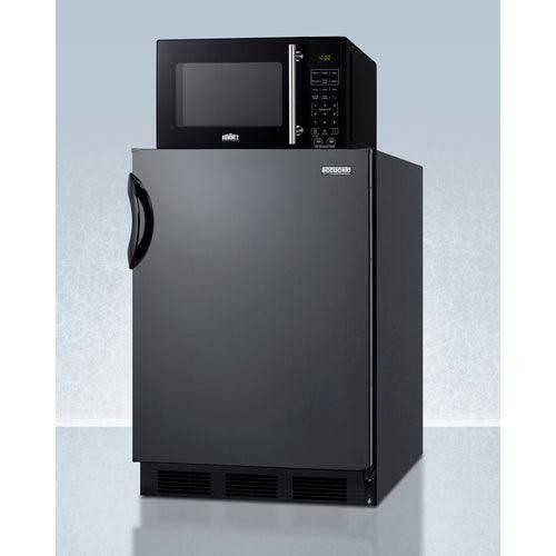 The CWSUITE43G is comprised of five pieces: refrigerator cabinet (model CWR2ADA), Summit SCR1841B beverage center, trash bin cabinet CWC5ADA, microwave SM903BSA, and cabinet hutch CWH1. The cabinetry ships full assembled and individually packaged, allowing you to rearrange the layout to best suit the needs of your space. The cabinet height (minus the hutch) is 34″ in order to comply with ADA guidelines for accessibility. With the hutch installed, this unit’s overall height is 71.5″.