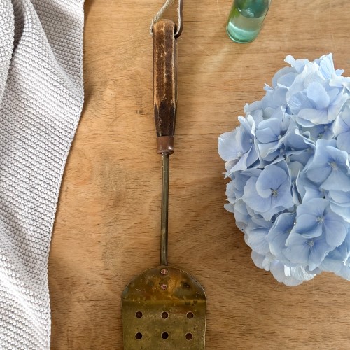 An exceptionally characterful vintage kitchen tool, handmade with real care and craftsmanship. This spatula features a beautifully timeworn brass slotted head, attached with hand-riveted copper nails to a long, sturdy shaft, and finished with a carved wooden handle worn smooth from years of use.