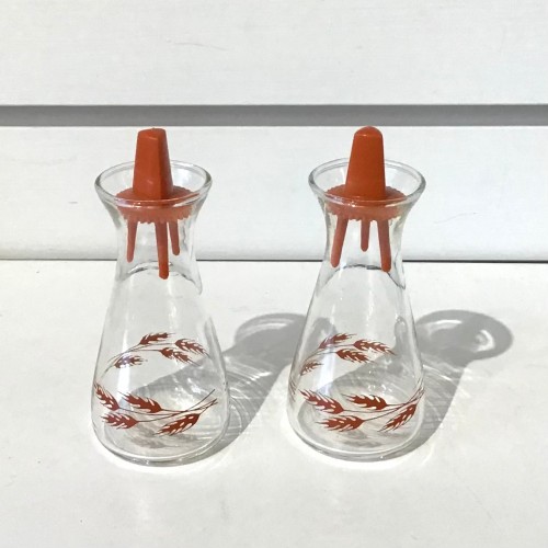Vintage Pyrex salt and pepper shakers with plastic lids. Autumn Harvest Wheat pattern.